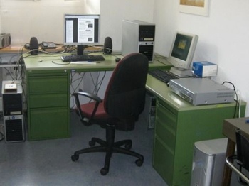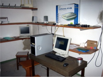 Foto rechts: Der Brückenkopf. Unsere Schnittstelle zum www in einem speziell gesicherten Raum im Keller der JVA. Nicht schön… aber praktisch. Im Vordergrund: die Maschine auf der wir mit einem Apache-Webserver unsere beiden Sites hosten.